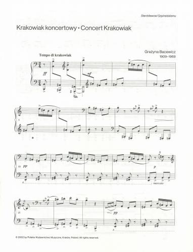 This piece, dedicated to Stanisław Szpinalski, Paderewski's pupil and a well-known performer of his Fantastic Krakowiak, involuntarily brings to mind the work of the great master, but it has little in common with it; the compositions belong to two different epochs. In Bacewicz's output the piano has a specific sharpness of the tone emphasised by the use of extreme registers. Harmonies have a characteristic roughness and pungency, arising from various combinations of intervals of seconds, fourths and fifths. The lively musical narrative, both light and mercurial, is evolved, in this case, from motifs of popular krakowiak melodies, which the composer subjects to all kinds of motivic, harmonic and rhythmic transformations - sometimes deceptive or even grotesque (the change of major/minor modes), as if poking fun at the listener. Bacewicz's Krakowiak strikes one with the freshness of its original creative invention, full of ideas and with its effective, ''concert'' bravura in the full sense of the word.