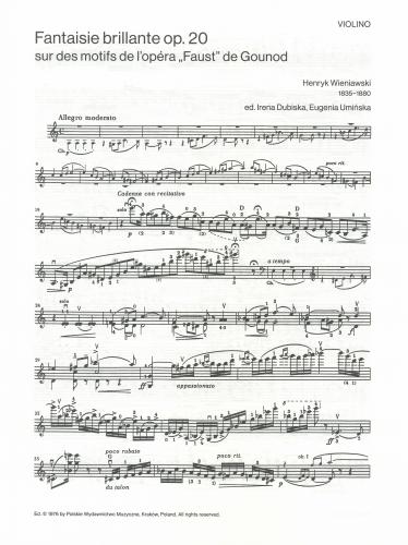 ''Fantaisie brillante'' on themes from Gounod's Faust by Wieniawski was written in 1870. The composer treated the work as a dramatic scene. Thus the whole consists of an introduction, recitative, lyrical aria, dramatic episode and ballet finale. The virtuoso-technical aspect of the work accounts for its continuing freshness and vitality.