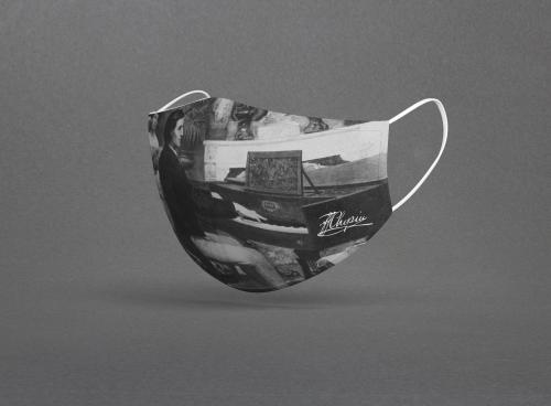Gray protective mask with the imprint Chopin on the piano and an elastic band for the ears
