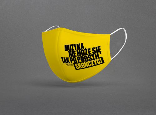 Yellow protective mask with a quote (available only in Polish) and an elastic band for the ears.