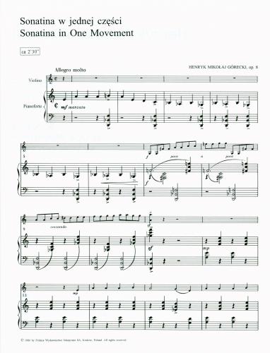 The work belongs to a group of Górecki's first compositions with opus numbers, written in the initial years of his studies. Its construction, based on traditional main formal foundations, is compact and transparent. The expression and the lively musical action of the work are determined by characteristic features, typical of the early phase of the composer's output, such as metric and rhythmic schemes with accentual irregularities, dynamic contrasts, culminating in short sections within the framework of big volume as well as atonal harmonies. The Sonatina is a successful work of contemporary music enriching the didactic repertory.
