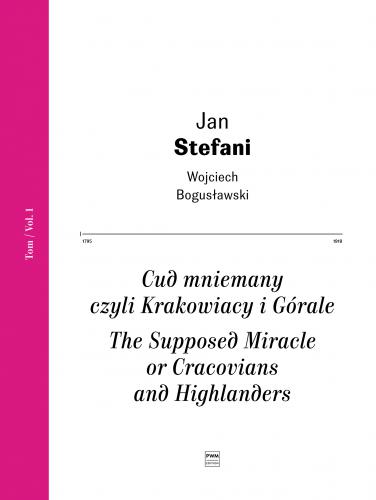 The works of Jan Stefani (c.1750-1829) coincided with one of the more difficult periods in Polish history. This musician of Czech origins arrived in Poland following the First Partition of the Commonwealth of Poland and Lithuania in 1772 and stayed till his death. His output brought new aesthetic qualities to Polish music and became a cornerstone for later composers. Some of Stefani's works - like the opera Cud mniemany, czyli Krakowiacy i Górale (The supposed miracle, or Cracovians and Highlanders) - found a permanent place in the repertoire, while others feel into oblivion. Today we wish to revive awareness of one of the leading composers of the reign of Stanislaus Augustus and the early nine-teenth century. With that aim in mind, we present the series The Complete Works od Jan Stefani. We trust that each succesive volume will expand knowledge of this composer and of the epoch in which he worked. And we hope that his significant legacy, although only a small proportion of it has survived to our times, will find a place in concert halls and that the scores prepared in this series will give rise to numerous recordings.