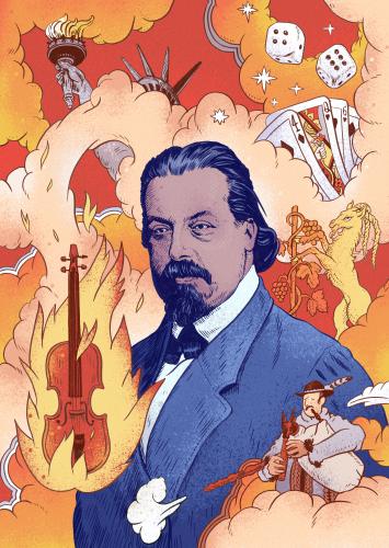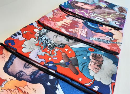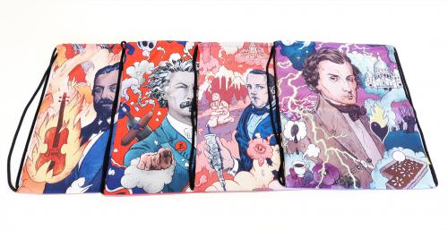 A colorful backpack/sack made of extremely thick, durable and waterproof polyester, decorated with a graphic with a bust of Henryk Wieniawski by Mateusz Kołek. Very practical and effective.