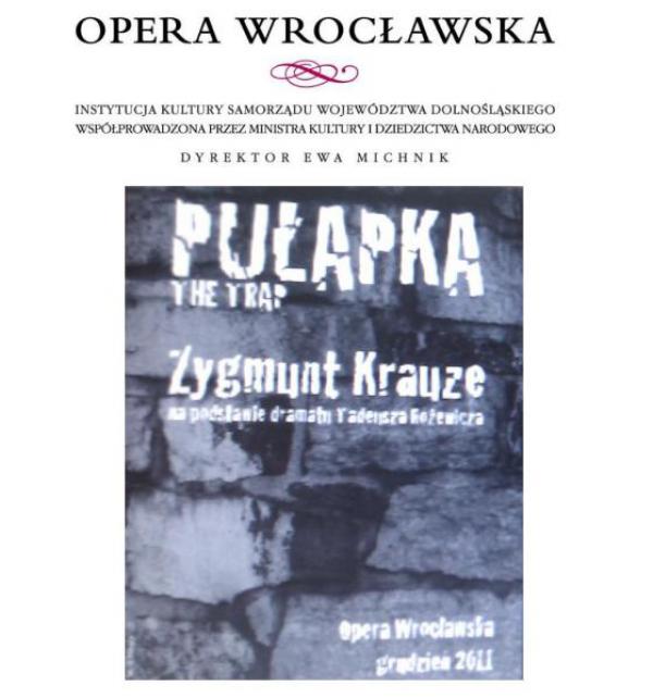Zygmunt Krauze’s new one-act opera, „Pułapka”, will be on the stage of Wrocław Opera already on 17 December 2011. The work, staged by Ewelina Piotrowiak, will be led by Tomasz Szreder, with Mariusz Godlewski (baritone) starring in the main role. This premiere will certainly be a great culmination to the celebrations of Tadeusz Różewicz’s 90th birthday.The 100 - minute work consists of fourteen pitcures.The libretto was prepared by the composer in cooperation with Grzegorz Jarzyna and is based on the famous drama. As Jacek Marczyński writes („Rzeczpospolita”), “Zygmunt Krauze had the idea of composing an opera based on one of the most important plays by Tadeusz Różewicz in 2006 after seeing „Pułapka” at the Kontakt festival in Toruń. It was a Hungarian presentation directed by Péter Gothár.” “It made a great impression on me. I realized that this was a phenomenal subject for an opera. What's more, I already knew how I should do it,” the composer said. There was still the problem of obtaining the author’s consent. Zygmunt Krauze met Tadeusz Różewicz in 1999 during the Fundacja Kultury awards ceremony when the poet received his prize. The evening at the Royal Castle was graced with a performance of five of Krauze’s songs to poems by the laureate, who regarded the musical version of his poetry with great appreciation. A few years after the „Pułapka” opera proposal he waited a few months with the answer, but in the end the composer received a green light. “I informed director Ewa Michnik about this,” says Zygmunt Krauze, “She immediately took up the idea.”