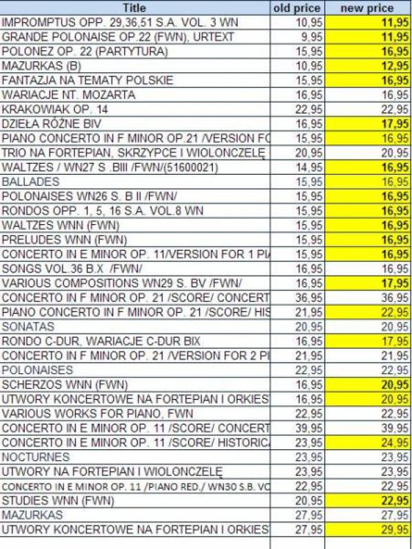 We inform you that from March 15, 2013 the prices of notes of National Edition of the Works of Fryderyk Chopin will be changed.