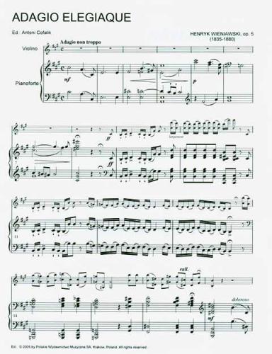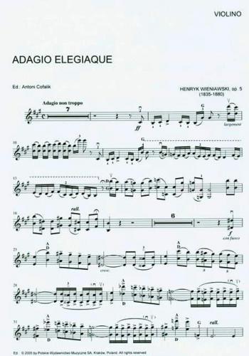 Adagio élégiaque, Op. 5, is one of the earliest compositions by Henryk Wieniawski. The work was composed during the sixteen year old's grand Russian tour as an already famous virtuoso. In view of its peculiar pathos and prevailing lyricism, it can be regarded as a piece of salon music. It is hoped that a new edition - the first for many eyars - of this less popular composition by Henryk Wieniawski will catch the attention of violinists and violin teachers. I especially recommend it to students wishing to develop the expressive, tonal aspects of their playing as well as octave and arpeggiated chord techniques.