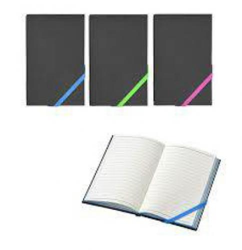 A6 notebook with 80 sheets in ecru color. Closed with an elastic band and a bright, neon color back. Available colors: blue, green, pink.