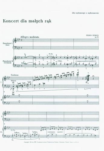 The words 'for small hands' used in the title of the Concerto may suggest that it is an easy piece aimed at children. Weel, it is not as such. Its volume (duration 19 minutes) already creates a problem of a long concentration span and music tension. (...) Technically speaking, the work requires high manual agility, as well as imagination and virtuosity at times. (...) Once the performer of this concert has overcome the hardships of comprehending and mastering parts I and II, there awaits an award - part III: uncomplicated text, pure joy, life, temperament, wit, cheek. The piece ends with the krakowiak in fff dynamics! [Andrzej Jasiński]