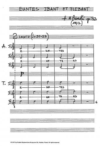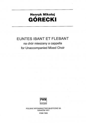 Euntes ibant et flebant starts the current of sacred works for unaccompanied choir in Góreck's output. Writing the textual layer of the work, the composer used two excerpts from the Book of Psalms (125/126. 6 and 94/95. 6). The musical language of the work is based on the notes of Górecki's ''motto'': d-e-f, which penetrate the entire work in various combinations. The composition is extremely interesting from the harmonic point of view, as it constitutes a sublimated synthesis of the major-minor system with the folk music modality. This procedure provides the work with an ''extraterrestrial'', meditative character, emphasized in addition by the strict psalmody appearing more or less in the middle of the piece.