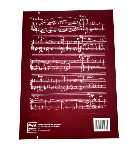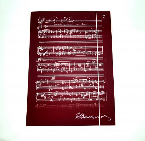 Elegant burgundy cardboard folder coated with luminous foil, both N and A4 size. Covered in hand-written sheet music by Grażyna Bacewicz herself.