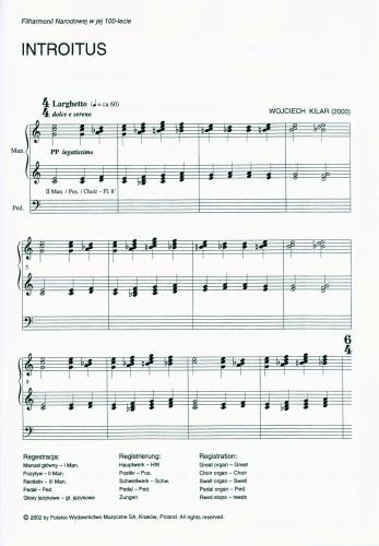 ''Introitus'' was performed for the first time by Andrzej Chorosiński as an integral part of ''Missa pro pace'' during the world premiere of this Mass on 12 January 2001 in the National Philharmonic in Warsaw, thus inaugurating also the new organ of the Philharmonic.