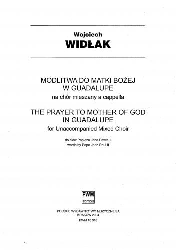 In the first version ''The Prayer to the Mother of God in Guadalupe'' is scored for mixed choir, brass instruments, percussion and double basses. Its premiere took place in Cracow on 8 May 2000. Soon afterwards, bearing in mind the practical performing aspect, I made the present version for unaccompanied mixed choir. Both versions of the composition are typically sacred in nature: the music plays a subservient role to the deep, universal content of the prayer. The vocal-instrumental version has clearly solemn overtones, while the a cappella version introduces the listener to the more austere atmosphere of contemplation and personal prayer. The verbal layer of the composition consists of excerpts from the prayer delivered by the Holy Father in Mexico in January 1979. I heve arranged them so that they form a kind of litany, starting and ending with the same main invocation. The musical language of the work, simple and intelligible, contains some archaic elements. It ought to harmonise with a church interior and help in prayer. That is why ''The Prayer to the Mother of God in Guadalupe'' is, above all, suitable as a setting for Catholic services (especially those which are ''Marian'' in content), and enriches the choral music repertory at the same time. [Wojciech Widłak]