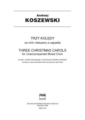 'Three Christmas Carols'' for mixed choir contains a popular Polish christmas carol - ''Chrystus Pan się narodził'' and two pieces with latin text.