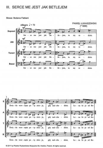 Paweł Łukaszewskis invaluable contribution in expanding Polish Carol literature is confirmed by a new collection containing three carols, written in 2002 to words by Bożena Fabiani: Do stajenki, Niebo Cię zesłało, Serce me jest jak Betlejem.