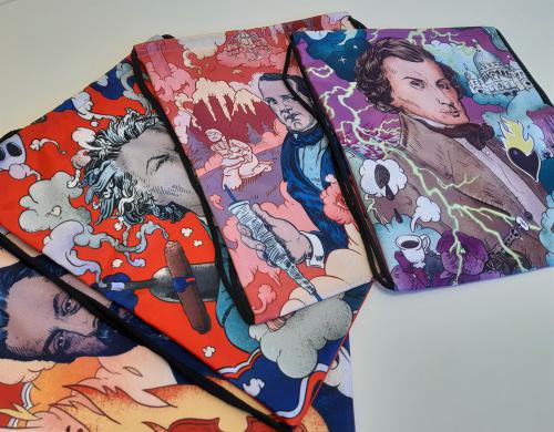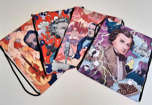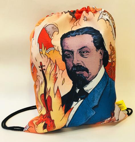 A colorful backpack/sack made of extremely thick, durable and waterproof polyester, decorated with a graphic with a bust of Henryk Wieniawski by Mateusz Kołek. Very practical and effective.