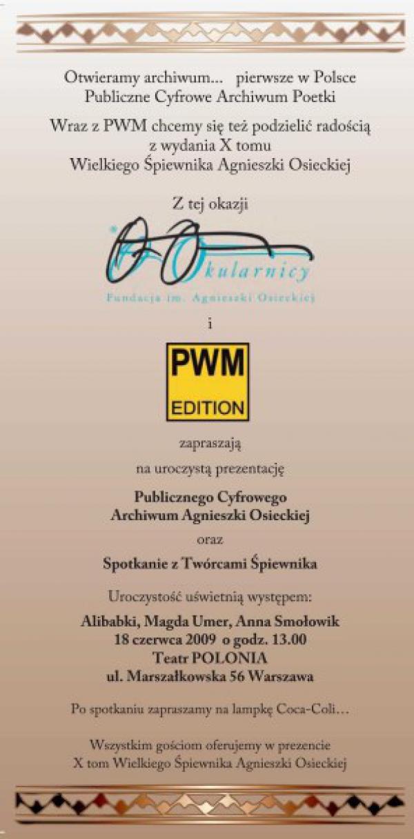 Zapraszamy na otwarcie pierwszego w Polsce Publicznego Cyfrowego Archiwum Agnieszki Osieckiej i spotkanie z twórcami Śpiewnika.18 czerwca o godz. 13 w Warszawie, w Teatrze Polonia, odbędzie się uroczyste otwarcie pierwszego w Polsce Publicznego Cyfrowego Archiwum Poetki oraz promocja ostatniego - 10. tomu Wielkiego Śpiewnika Agnieszki Osieckiej.