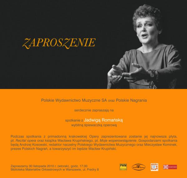 Zapraszamy na spotkanie z primadonną Opery Krakowskiej Jadwigą Romańską, podczas którego zostanie zaprezentowana jej najnowsza płyta pt. „Recital opera”. Podczas spotkania, które odbędzie się 30 listopada 2010r. w siedzibie Biblioteki Materiałów Orkiestrowych w Warszawie, ul. Fredry 8 o godz. 17.00, zostanie również zaprezentowana książka Wacława Krupińskiego pt. „Moje woperowstąpienie”. Będzie można ją nabyć przy odpowiednim stanowisku.Gospodarzami spotkania będą Andrzej Kosowski, redaktor naczelny Polskiego Wydawnictwa Muzycznego, oraz Mieczysław Kominek, prezes Polskich Nagrań. Towarzyszyć im będzie Wacław Krupiński.