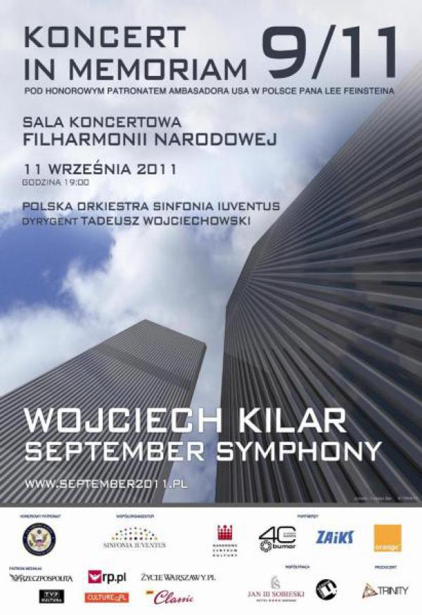 Uroczystym koncertem Polska Orkiestra Sinfonia Iuventus pod dyrekcją Tadeusza Wojciechowskiego uczci pamięć ofiar zamachów terrorystycznych na World Trade Center w Nowym Jorku w 10. rocznicę tych wydarzeń. Honorowy patronat nad koncertem objął Ambasador USA w Polsce Lee Feinstein. Podczas koncertu zabrzmi "September Symphony" Wojciecha Kilara, dzieło powstałe pod wpływem wydarzeń z 11 września 2001 roku. Symfonia nie powstałaby - wspomina Wojciech Kilar – gdyby nie tragedia 11 września, która wstrząsnęła mną tak jak wszystkimi. Wiadomość o tym dotarła do mnie w zupełnie odmiennych okolicznościach. Byłem w pięknym, jesiennym, słonecznym Paryżu na obiedzie z Romanem Polańskim, opowiadaliśmy sobie polskie kawały, przypominaliśmy stare piosenki. Wróciłem do hotelu i zobaczyłem zupełnie inny świat - walące się wieże Nowego Jorku.Koncert odbędzie się w niedzielę 11 września 2011 w Sali Koncertowej Filharmonii Narodowej. Szczegółowe informacje na temat koncertu znajdują się na stronie: http://www.september2011.pl/