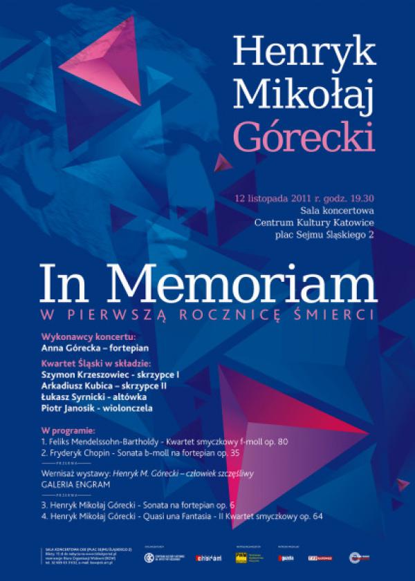 12 listopada 2011 roku przypada pierwsza rocznica śmierci Henryka Mikołaja Góreckiego. Tego dnia w Centrum Kultury Katowice im. Krystyny Bochenek odbędzie się koncert ku pamięci tego wybitnego polskiego kompozytora. Koncert odbędzie się 12 listopada 2011 roku o godzinie 19.30.Program koncertu: