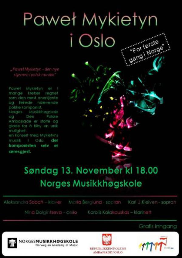 13 listopada 2011r. o godz. 18.00 w Norweskiej Akademii Muzycznej zabrzmią utwory Pawła Mykietyna. W programie koncertu znalazły się utwory: "...choć doleciał Dedal..." trio na fortepian, klarnet i wiolonczelę (1990) "Sonety Szekspira" na sopran męski i fortepian (2000) "Cztery preludia" na fortepian (1992) "Epifora" na fortepian i taśmę (1996).Organizatorem koncertu są Ambasada Rzeczypospolitej Polskiej w Norwegii i Norweska Akademia Muzyczna.