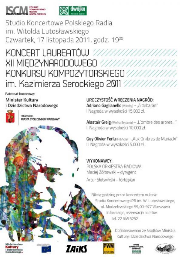 17 listopada 2011 o godz. 19:00 w Studiu Koncertowym Polskiego Radia im. Witolda Lutosławskiego w Warszawie odbędzie się koncert laureatów XII Międzynarodowego Konkursu Kompozytorskiego im. Kazimierza Serockiego. Podczas koncertu zabrzmią utwory włoskiego kompozytora Adriano Gaglianello, laureata pierwszej nagrody w Konkursie oraz Nagrody Specjalnej Polskiego Wydawnictwa Muzycznego (w postaci kompletu polskich partytur współczesnych), a także Alastaira Griega (Wielka Brytania, II nagroda) i Guya Oliviera Ferla (Francja, III nagroda).Konkurs im. Kazimierza Serockiego organizowany jest w Warszawie od 1984 roku. Podczas pierwszej jego edycji w jury zasiadał m.in. Witold Lutosławski, w kolejnych prace oceniali również tak znakomici kompozytorzy, jak Krzysztof Penderecki, Zygmunt Krauze, Włodzimierz Kotoński Marta Ptaszyńska, Marek Stachowski, Grażyna Pstrokońska-Nawratil czy Hanna Kulety. W każdej edycji Konkursu w jury zasiadają także wybitni kompozytorzy zagraniczni. W tym roku byli to: Dan Yuhas, Ramon Anthin, Stephen Lias oraz Indra Riše. Regulamin Konkursu określa konkretny skład wykonawczy, na jaki utwór w ma być przeznaczony. W tym roku jest to orkiestra symfoniczna. W wykonaniu Polskiej Orkiestry Radiowej pod dyrekcją Macieja Żółtowskiego zabrzmią więc utwory: