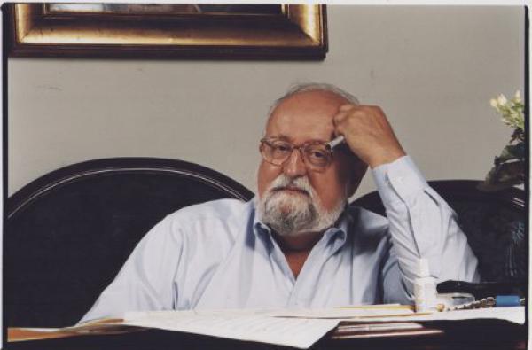 Krzysztof Penderecki (ur. 1933 r. w Dębicy), kompozytor, dyrygent, pedagog, były rektor Akademii Muzycznej w Krakowie. Pochodzi z muzykalnej rodziny. Początkowo uczył się gry na skrzypcach, by w latach 1955-1958 studiować kompozycję w PWSM w Krakowie w klasie Artura Malawskiego. Pierwszy znaczący sukces przyszedł w 1959 – Penderecki zdobył 3 pierwsze nagrody w konkursie Związku Kompozytorów Polskich za „Strofy”, „Emanacje” oraz „Psalmy”.