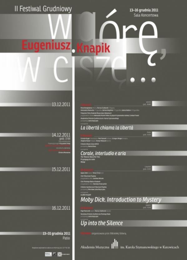 W dniach 13 – 16 grudnia 2011 w Akademii Muzycznej im. Karola Szymanowskiego w Katowicach odbędzie się II Festiwal Grudniowy – "Eugeniusz Knapik - w górę, w ciszę…" Będzie to kolejne, po niedawnym koncercie Narodowej Orkiestry Symfonicznej Polskiego Radia, wydarzenie artystyczne, wpisujące się w obchody jubileuszu sześćdziesiątych urodzin kompozytora. W ramach Festiwalu odbędą się cztery koncerty, podczas których zabrzmią: „Libertà chiama la Libertà” w wykonaniu Orkiestry Symfonicznej i Chóru Akademii Muzycznej pod dyrekcją Jacka Kaspszyka, „Corale, interludio e aria” (orkiestra AUKSO pod dyrekcją Marka Mosia), „Introduction to Mystery” i „La flute de jade” (Chór Filharmonii Śląskiej, Chór Polskiego Radia w Krakowie i Orkiestra Symfoniczna Filharmonii Śląskiej pod dyrekcją Mirosława Jacka Błaszczyka) oraz „Up into the silence” – Narodowa Orkiestra Symfoniczna Polskiego Radia pod dyrekcją Jacka Kaspszyka.Szczegółowe informacje na temat koncertów znajdują się na stronie: /www.am.katowice.pl