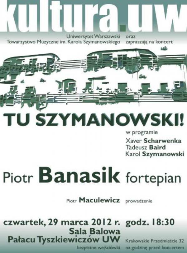 Uniwersytet Warszawski i Towarzystwo Muzyczne im. Karola Szymanowskiego zapraszają na kolejny koncert TU SZYMANOWSKI! w ramach cyklu kultura.uw. Okazją do zaprezentowania muzyki Karola Szymanowskiego będzie 75. rocznica jego śmierci, przypadająca 29 marca. Usłyszymy m.in. Etiudę b-moll op. 4 nr 3, jeden z najbardziej znanych utworów z pierwszego okresu twórczości kompozytora. Zabrzmią też kompozycje Tadeusza Bairda, zwanego „ostatnim polskim romantykiem” – będą to I i II Sonatina oraz Mała suita dziecięca. Za przyczyną zainteresowań naukowych wykonawcy recitalu – pianisty Piotra Banasika, wykładowcy katowickiej Akademii Muzycznej – będziemy też mogli poznać dzieła Xavera Scharwenki, urodzonego w wielkopolskich Szamotułach niemieckiego kompozytora przełomu XIX i XX w., cenionego w swoich czasach interpretatora dzieł Fryderyka Chopina, wydawcy i pedagoga.Wprowadzenie do koncertu przedstawi mgr Piotr Maculewicz, kierownik Gabinetu Zbiorów Muzycznych Biblioteki Uniwersyteckiej w Warszawie. Istniejące od ponad 50 lat w BUW Archiwum Kompozytorów Polskich XX Wieku jest największą skarbnicą pamiątek po Szymanowskim, posiada także niemal całą spuściznę kompozytorską Tadeusza Bairda. Wykonanie utworów Tadeusza Bairda odbywa się i jest współfinansowane w ramach programu Instytutu Muzyki i Tańca „Nowe interpretacje”.