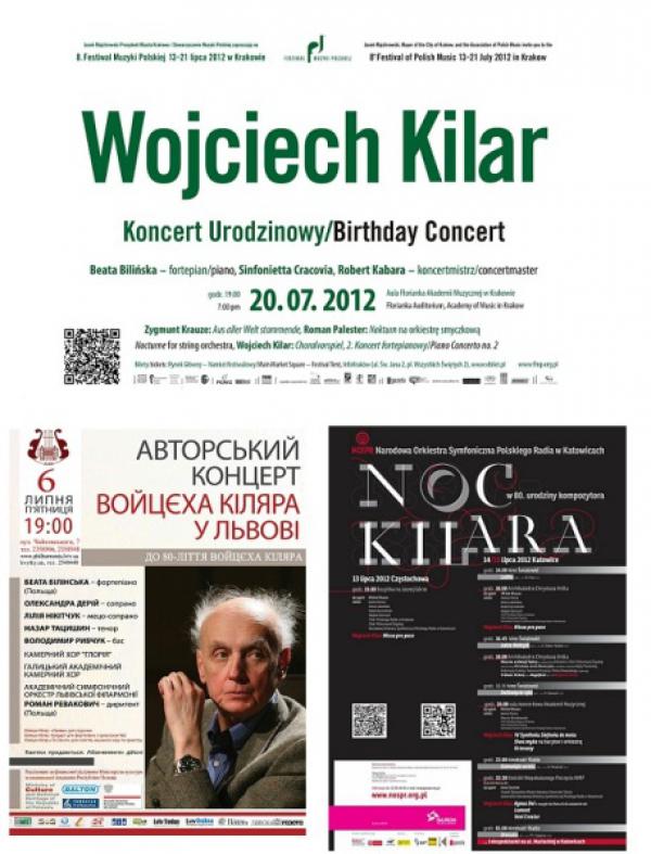 Obchodzone w tym roku 80. urodziny Wojciecha Kilara świętuje większość polskich instytucji muzycznych oraz melomanów. Punktem kulminacyjnym jest 17 lipca (dzień urodzin Kompozytora), dlatego wszelkie imprezy z tym związane nabierają właśnie coraz większego rozpędu.Za nami już Gala Kilarowska na Festiwalu Muzyki Filmowej w Krakowie, koncerty jubileuszowe m.in. w Filharmonii Podkarpackiej (22. VI), Zabrzańskiej (29 VI), w Koninie (30 VI), Krakowie (30 VI), Olsztynie (1 IV), na Jasnej Górze (3 V) czy w Czeladzi, w ramach festiwalu Ave Maria (3 VI). A przed nami – jeszcze więcej muzycznych atrakcji.