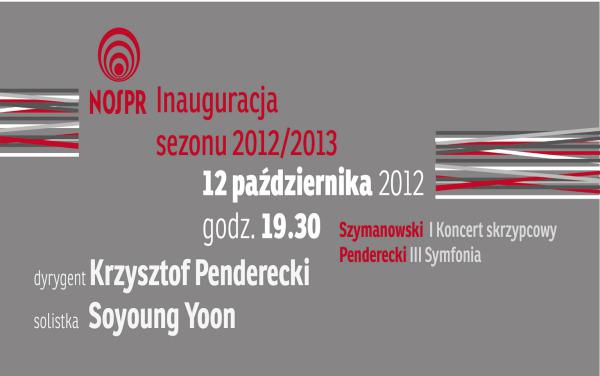 W piątek, 12 października o godz. 19.30, Narodowa Orkiestra Symfoniczna Polskiego Radia w Katowicach zainauguruje kolejny sezon artystyczny. Pierwszy abonamentowy koncert poprowadzi Krzysztof Penderecki.W partii solowej wystąpi Soyoung Yoon – zwyciężczyni ostatniej edycji Międzynarodowego Konkursu Skrzypcowego im. Henryka Wieniawskiego w Poznaniu (2011 r.). W jej wykonaniu melomani usłyszą I Koncert skrzypcowy Karola Szymanowskiego w ramach obchodów 130. rocznicy urodzin kompozytora. W drugiej części koncertu orkiestra zaprezentuje III Symfonię Krzysztofa Pendereckiego. Całość poprowadzi sam kompozytor.