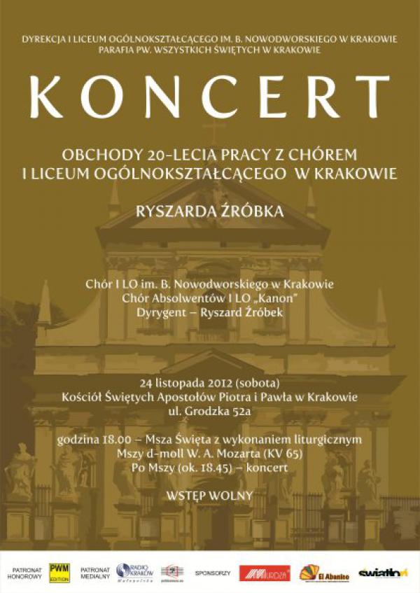 PWM objęło patronatem honorowym koncerty z okazji obchodów 20-lecia pracy Ryszarda Źróbka jako dyrygenta Chóru I LO im. B. Nowodworskiego w Krakowie. Na najbliższym koncercie usłyszymy „Missa brevis KV 65” W.A. Mozarta. Koncert odbędzie się 24 listopada w Kościele Świętych Apostołów Piotra i Pawła w Krakowie po mszy świętej o godz. 18:00.Data: 24.11.2012, godz. 18:00