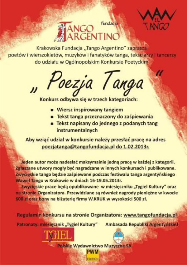 Krakowska Fundacja „Tango Argentino” organizuje konkurs poetycki - przedmiotem konkursu jest utwór poetycki związany z tangiem. Zgłoszenia przyjmowane są do 1 lutego 2013 r. Konkurs odbywa się w trzech kategoriach:1. Wiersz inspirowany tangiem