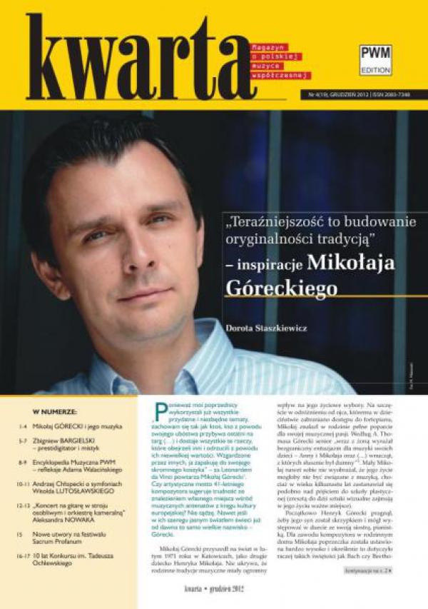 Bohaterami najnowszego numeru „Kwarty” są Mikołaj Górecki i Zbigniew Bargielski, których sylwetkom twórczym przyglądają się wnikliwie Dorota Staszkiewicz i Violetta Przech. Publikujemy również fragment książki Andrzeja Chłopeckiego o Witoldzie Lutosławskim. Fragment książki Andrzeja Chłopeckiego o Witoldzie Lutosławskim publikujemy dzięki uprzejmości Towarzystwa im. W. Lutosławskiego.Ponadto w tym numerze znajdziemy wspomnienia Adama Walacińskiego dotyczące pracy nad 12-tomową Encyklopedią Muzyczną PWM, której wydawanie ukończyliśmy w zeszłym roku, analizę „Koncertu” na gitarę w stroju osobliwym i orkiestrę kameralną Aleksandra Nowaka pióra Łukasza Dobrowolskiego, a także wiele ciekawych informacji o działalności naszej oficyny i kompozytorów z nią związanych. W tym numerze jak zwykle nie zabrakło informacji o nowych publikacjach płytowych, książkowych i nutowych.