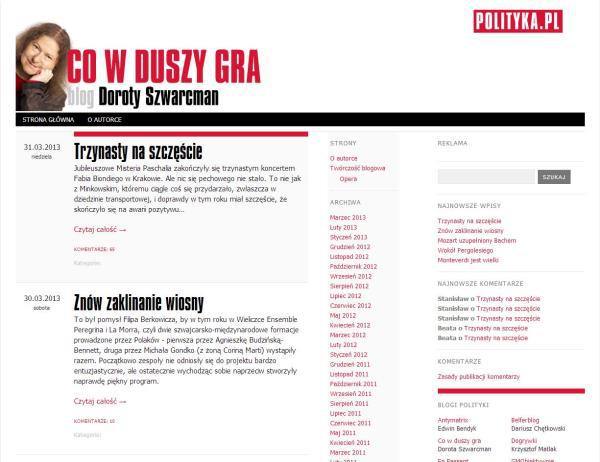 Blog Doroty Szwarcman „Co w duszy gra” wybrany został najlepszym blogiem dziennikarskim w rankingu przygotowanym przez miesięcznik PRESS. Jak czytamy w uzasadnieniu: "Czuć miłość do tematu, widać brak skrepowania politpoprawnością. Czyta się z przyjemnością równą obcowaniu z muzyką poważną. Blog dla tych, którzy interesują się muzyką. Pisany z pasja i znajomością tematu. Autorka ma autentyczną potrzebę podzielenia się tym, co widziała i przeżyła. Zachwyca umiejętność równie swobodnego pisania o Chopinie i Lutosławskim, jak i o Tomaszu Stańce. Ujęło mnie, że Dorota Szwarcman aktywnie udziela się w dyskusjach pod notkami – odnosi się do wypowiedzi czytelników, polemizuje z nimi, razem z czytelnikami zachwyca się podesłanymi przez nich w komentarzach linkami do utworów, wspólnie zastanawia nad fenomenem twórczości danego muzyka. Jest ekspertem, budzi respekt, ale jednocześnie nie stawia bariery komunikacyjnej, wręcz zachęca do kontaktu."Najlepszy blog dziennikarski znajduje się pod adresem: http://szwarcman.blog.polityka.pl/