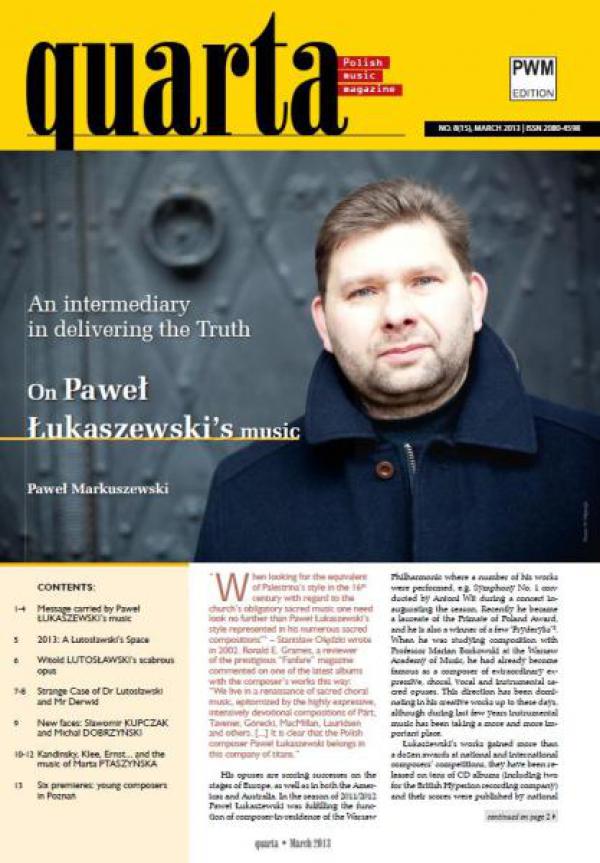 W najnowszym numerze Quarty piszemy m.in. o twórczości Pawła Łukaszewskiego, o Sławomirze Kupczaku i Michale Dobrzyńskim, którzy ostatnio "zadebiutowali" w PWM oraz o inspiracjach malarskich w muzyce Marty Ptaszyńskiej. Nie mogło też zabraknąć artykułów poświęconych Witoldowi Lutosławskiemu. Aż trzy artykuły poświęcone zostały kompozytorowi, którego 100. rocznicę urodzin świętujemy w tym roku. W pierwszym krótko charakteryzujemy obchody Roku Lutosławskiego - zwłaszcza piszemy o naszych przedsięwzięciach wydawniczych związanych z tą rocznicą, a mamy się czym pochwalić, gdyż w tym roku ujrzą światło dzienne utwory Lutosławskiego, które nie były wydane za jego życia. W drugim artykule Małgorzata Sułek zajmuje się twórczością Witolda Lutosławskiego w okresie socrealizmu, w trzecim zaś Dorota Kozińska przygląda się „rozdwojeniu jaźni” kompozytorskiej Lutosławskiego, czyli twórczości pod pseudonimem Derwid.W najnowszym numerze nie zabrakło też informacji o powrocie do naszego wydawnictwa Tadeusza Wieleckiego, który powierzył nam wydanie swojego utworu „Czas kamieni” oraz o najnowszych publikacjach i materiałach orkiestrowych.