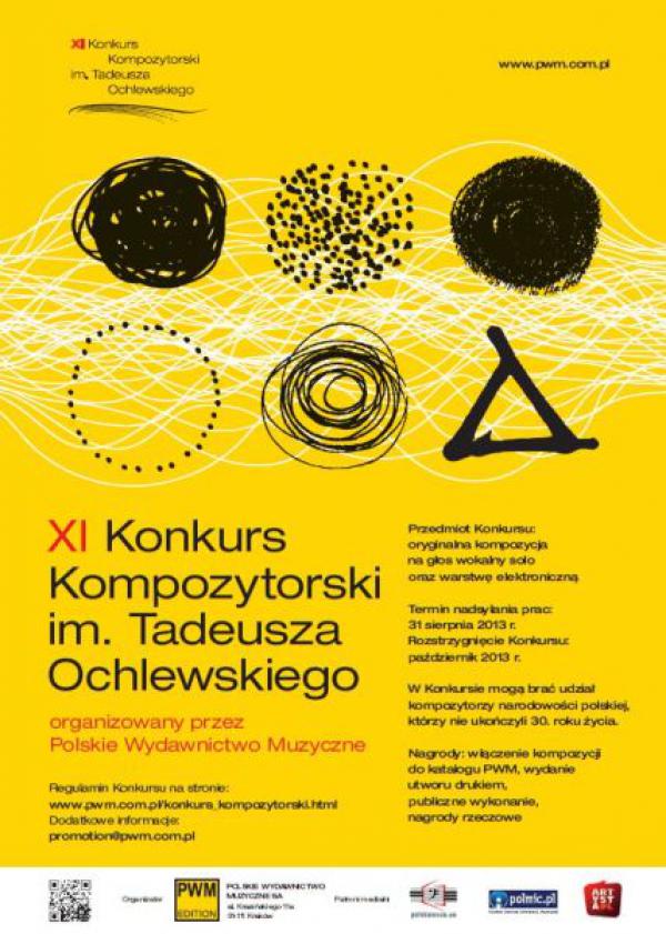 Już tylko kilka dni czekamy na zgłoszenia do tegorocznej XI edycji Konkursu Kompozytorskiego im. Tadeusza Ochlewskiego. W tym roku przedmiotem konkursu jest oryginalna kompozycja na solowy głos wokalny i warstwę elektroniczną.Konkurs Kompozytorski im. Tadeusza Ochlewskiego jest organizowany przez Polskie Wydawnictwo Muzyczne i ma na celu promocję młodych kompozytorów. Patronem konkursu jest założyciel PWM, animator życia muzycznego w Polsce, pedagog i skrzypek Tadeusz Ochlewski.