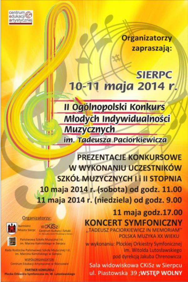 11 maja w ramach II Ogólnopolskiego Konkursu Młodych Indywidualności Muzycznych im. Tadeusza Paciorkiewicza w Sierpcu odbędzie się koncert polskiej muzyki, który wykona Płocka Orkiestra Symfoniczna pod dyrekcją Jakuba Chrenowicza.