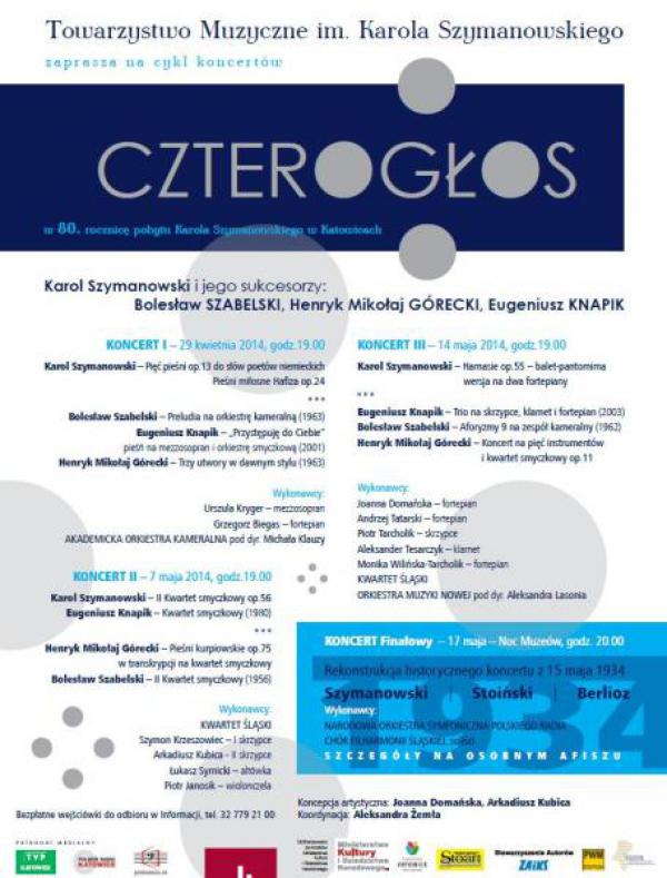 Cykl koncertów „Czterogłos” wiąże się z 80. rocznicą pobytu Karola Szymanowskiego w Katowicach. W ramach trzech koncertów kameralnych (29 kwietnia, 7 i 14 maja) przedstawiana jest twórczość Karola Szymanowskiego oraz kompozytorów związanych z Akademią Muzyczną w Katowicach: Bolesława Szabelskiego, Henryka Mikołaja Góreckiego, Eugeniusza Knapika - uczniów Szymanowskiego w kolejnych pokoleniach.