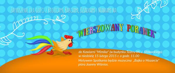 Zapraszamy dzieci z rodzicami, babciami, dziadkami i nianiami na „Wierszowany Poranek” do kawiarni „Mimika” (w budynku Teatru im. J. Słowackiego w Krakowie). w niedzielę 15 lutego 2015 o godzinie 11:00. Motywem spotkania będzie muzyczna „Bajka o Mozarcie” pióra Joanny Wiśnios. Wstęp wolny.