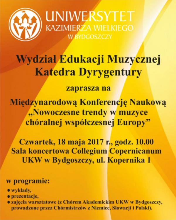 W dniu 18 maja 2017 roku w sali koncertowej Collegium Copernicanum Uniwersytetu Kazimierza Wielkiego w Bydgoszczy odbędzie się Międzynarodowa Konferencja Naukowa "Nowoczesne trendy w muzyce chóralnej współczesnej Europy".