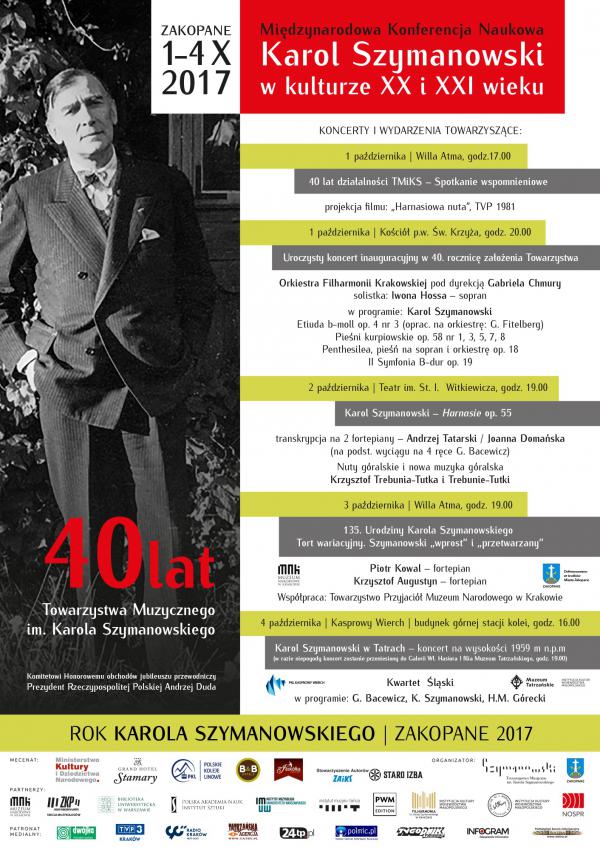 Koncert Filharmonii Krakowskiej w 40. rocznicę założenia Towarzystwa inauguruje jednocześnie Międzynarodową Konferencję Naukową „Karol Szymanowski w kulturze XX i XXI wieku” (szczegóły tutaj).
