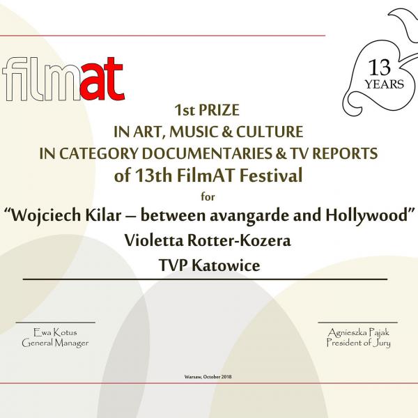 Film dokumentalny „Wojciech Kilar – między awangardą a Hollywood” został nagrodzony aż w dwóch kategoriach podczas 13th FilmAT Festival - Międzynarodowego Festiwalu Filmów Turystycznych i Korporacyjnych w Warszawie.