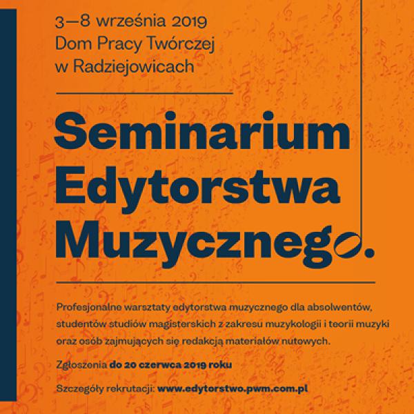 Polskie Wydawnictwo Muzyczne, Narodowy Instytut Fryderyka Chopina oraz Instytut Muzykologii Uniwersytetu Jagiellońskiego w Krakowie zapraszają na czwartą edycję Seminarium Edytorstwa Muzycznego, które odbędzie się w Radziejowicach w dniach 3-8 września 2019 roku.