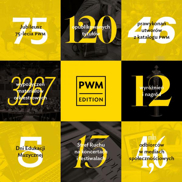 Katalog książkowy PWM-u zasiliło w tym roku ponad 20 książek w formie papierowej i cyfrowej. Nie zabrakło pozycji zaskakujących, zyskujących rozgłos i miano bestsellerów. Do sprzedaży trafiła długo wyczekiwana Muzyka w zamku niebios Johna Eliota Gardinera w tłumaczeniu Katarzyny Matwiejczuk. Książka ta we wciągający sposób ukazuje Jana Sebastiana Bacha – jednego z twórców najważniejszych, ale też o najbardziej enigmatycznym życiu prywatnym – jako kompozytora i człowieka. PWM otworzyło także serię Małe Monografie, skierowaną do wszystkich miłośników kultury, którzy o kompozytorach chcieliby dowiedzieć się czegoś więcej, a jednak nie czują się na siłach, by przebrnąć przez wypełnione naukową terminologią opasłe publikacje. Dotychczas w serii ukazały się słowne portrety Witolda Lutosławskiego, Pawła Szymańskiego, Grażyny Bacewicz, Romana Palestra, a także Hectora Berlioza. Oficyna ogłosiła konkurs na napisanie monografii Ignacego Jana Paderewskiego, który rozstrzygnie się w przyszłym roku.