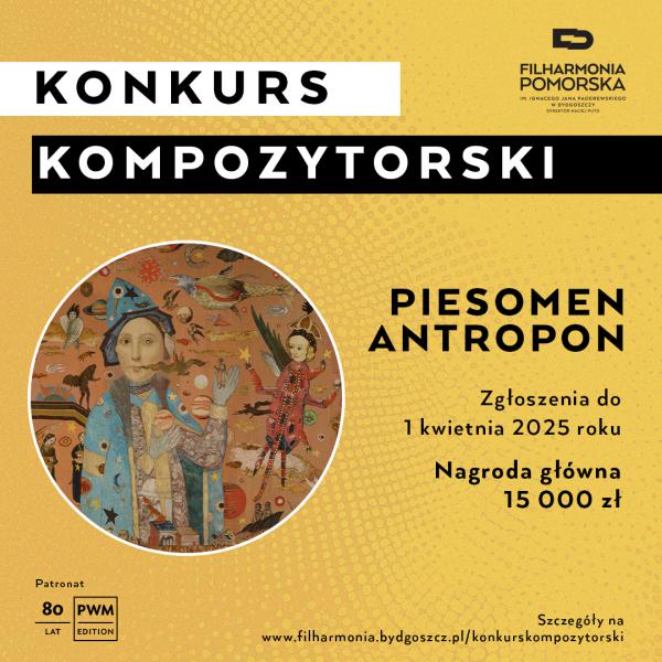 Filharmonia Pomorska im. Ignacego Jana Paderewskiego w Bydgoszczy zaprasza do udziału w Konkursie Kompozytorskim na utwór symfoniczny inspirowany gobelinem Jerzego Krechowicza Piesomen Antropon (Uczyńmy Człowieka) Ceta.Konkurs adresowany jest do profesjonalnych kompozytorów urodzonych przed 10 kwietnia 1999 r. Termin zgłoszenia partytur upływa z dniem 1 kwietnia 2025 roku.