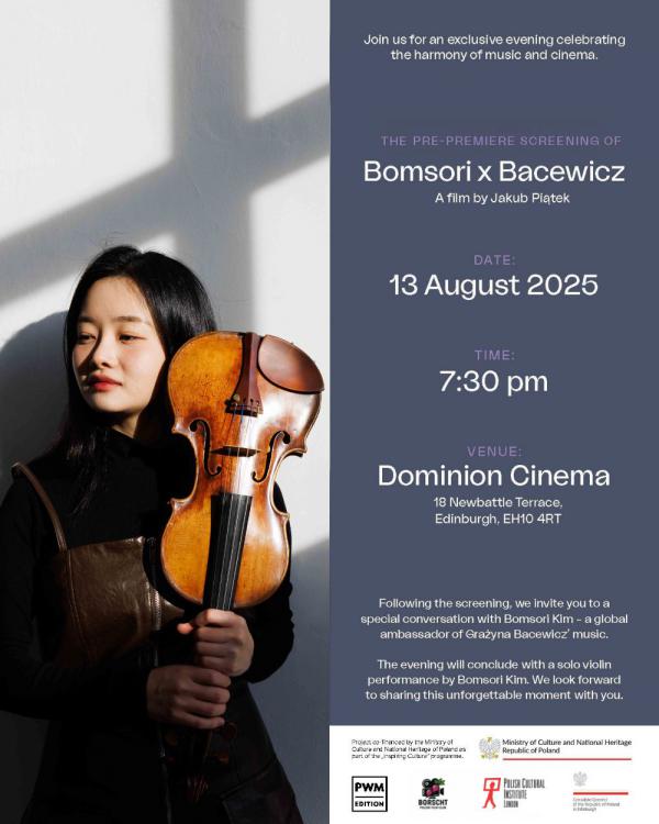 W ramach trwającego w Edynburgu pasma Focus on Poland poświęconego polskiej muzyce podczas Edinburgh International Festival, odbędzie się przedpremierowy pokaz krótkometrażowego filmu dokumentalnego „Bacewicz x Bomsori”, który przybliża dwie wybitne artystki: południowokoreańską skrzypaczkę Bomsori Kim oraz Grażynę Bacewicz, jedną z najważniejszych postaci polskiej muzyki XX wieku. Co łączy obie te postaci? Wyjątkowy obraz stworzony przez reżysera Jakuba Piątka.