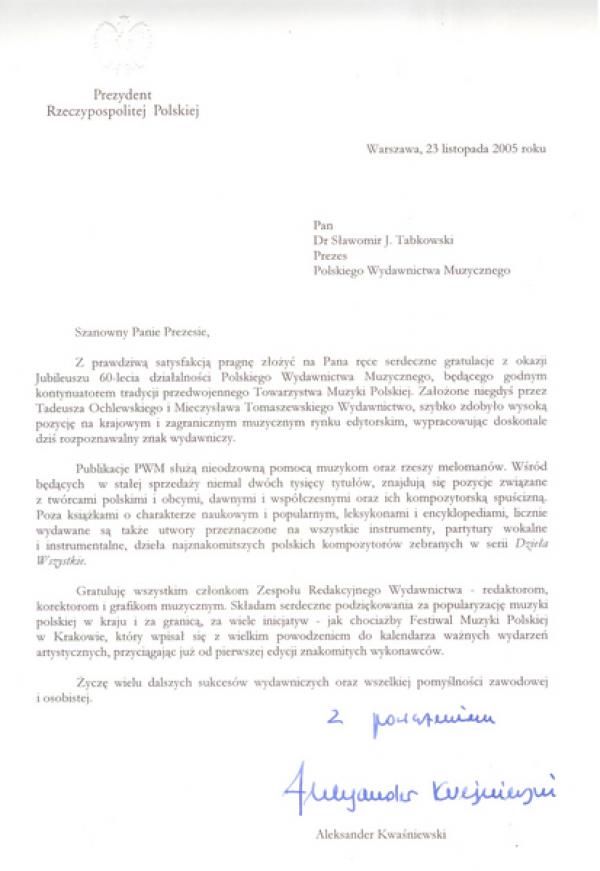 Z okazji jubileuszu sześćdziesięciolecia, PWM otrzymało list gratulacyjny od Prezydenta RP Aleksandra Kwaśniewskiego Prezydent RP Aleksander Kwaśniewski adresując list do Prezesa wydawnictwa - Sławomira Tabkowskiego, napisał m.in.: "Z prawdziwą satysfakcją pragnę złożyć na Pana ręce serdeczne gratulacje z okazji Jubileuszu 60-lecia działalności Polskiego Wydawnictwa Muzycznego, będącego godnym kontynuatorem tradycji przedwojennego Towarzystwa Muzyki Polskiej. Założone niegdyś przez Tadeusza Ochlewskiego i Mieczysława Tomaszewskiego Wydawnictwo, szybko zdobyło wysoką pozycję na krajowym i zagranicznym muzycznym rynku edytorskim, wypracowując doskonale dziś rozpoznawalny znak wydawniczy. (...) Gratuluję wszystkim członkom Zespołu Redakcyjnego Wydawnictwa - redaktorom, korektorom i grafikom muzycznym. Składam serdeczne podziękowania za popularyzację muzyki polskiej w kraju i za granicą, za wiele inicjatyw - jak chociażby Festiwal Muzyki Polskiej w Krakowie, który wpisał się z wielkim powodzeniem do kalendarza ważnych wydarzeń artystycznych, przyciągając już od pierwszej edycji znakomitych wykonawców".Najczęściej czytane: