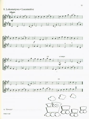 Prezentowany zbiór duetów na skrzypce powstał z myślą kształtowania świadomości muzycznej młodych muzyków w trudnej dziedzinie wykonawstwa, jaką jest muzyka kameralna. Moim celem nie było jednak wyłącznie rozwijanie słuchu i intelektu uczniów, lecz przede wszystkim obdarowanie ich przyjemnością wspólnego muzykowania. Duety posiadają obrazowe tytuły, mające wpływać na wyobraźnię skrzypków. Różnią się też długością od krótkich, 8-taktowych, dostępnych już dla pierwszoklasistów, po dłuższe, które mogą wykonać gimnazjaliści czy licealiści. Przeważa w nich forma trzyczęściowa ABA1. Specjalnie przemyślana i przygotowana konstrukcja daje możliwość wykazania się zarówno pierwszemu, jak i drugiemu skrzypkowi. We wszystkich prezentowanych utworkach każdy z wykonawców prowadzi raz głos wiodący, innym razem towarzyszący.