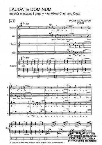 Psalm 150 – Laudate Dominum skomponowałem w roku 2009 na zamówienie Chóru Katedry Tarnowskiej „Puellae Orantes” który to zespół dokonał prawykonania wraz z towarzyszeniem Kwartetu DAFÔ pod moją dyrekcją w Tarnowie (19.09.2010). Utwór funkcjonuje w kilku wersjach: na chór żeński lub mieszany i smyczki lub organy. W wersji na chór żeński z towarzyszeniem organów został nagrany przez Chór Katedry Warszawsko-Praskiej „Musica Sacra” z towarzyszeniem Łukasza Farcinkiewicza pod moja dyrekcją, a płyta z tym nagraniem zdobyła nagrodę Fryderyk w roku 2011 [Paweł Łukaszewski].