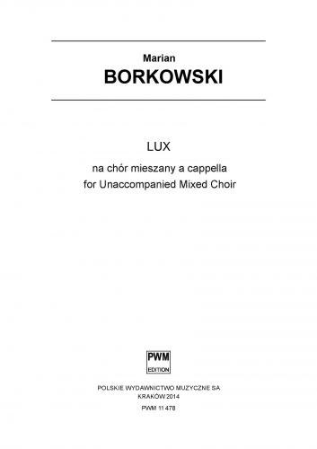 Prawykonanie utworu Lux (2010) Mariana Borkowskiego na chór mieszany a cappella odbyło się 3 maja 2012 w Częstochowie podczas XXII Międzynarodowego Festiwalu Muzyki Sakralnej Gaude Mater (Zespół Śpiewaków Miasta Katowice Camerata Silesia, dyr. Anna Szostak). Utwór znalazł się na płycie zawierającej wszystkie dzieła chóralne Mariana Borkowskiego, nominowanej do Nagrody „Fryderyka” (Polski Chór Kameralny, dyr. Jan Łukaszewski, DUX 0995, Warszawa 2013).